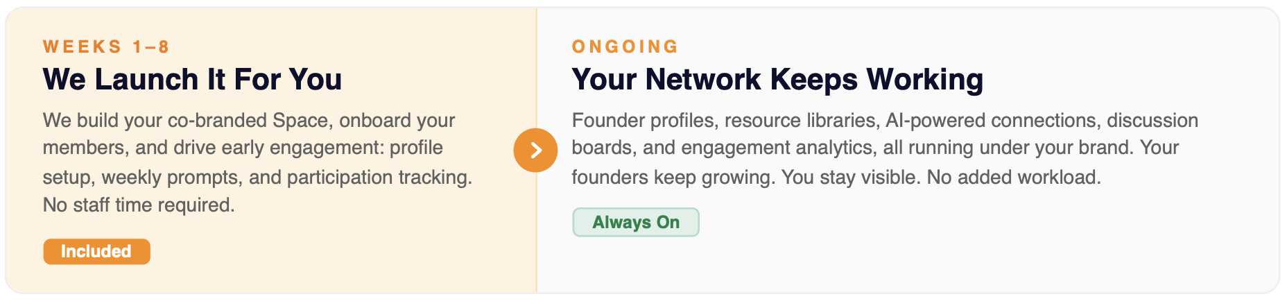 Maintain visibility, strengthen engagement, and extend the value of your network well beyond a single program or cohort.